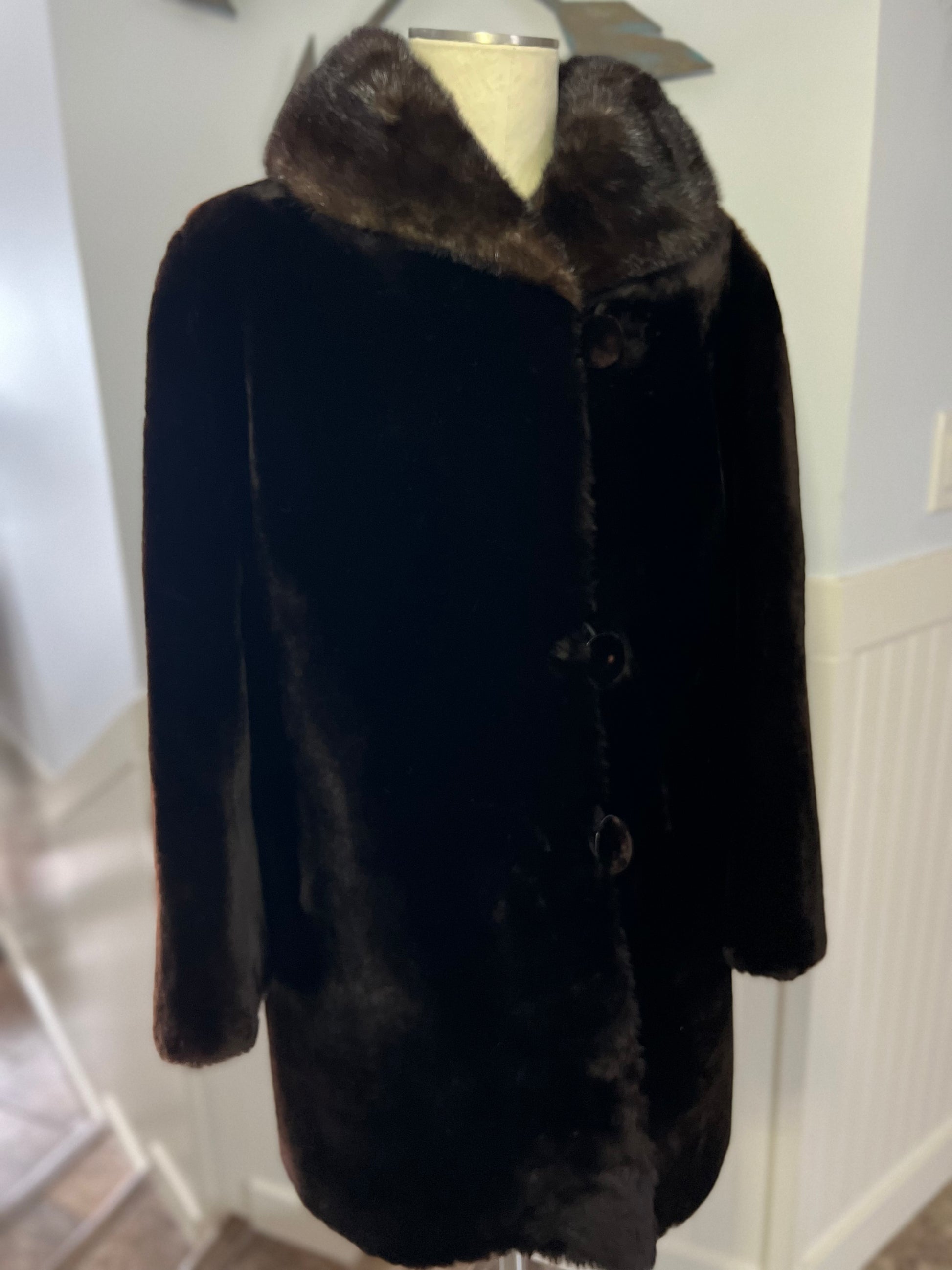 This vintage coat features a rich, deep espresso-brown tone that reads nearly black in low light. The beaver fur body is dense, plush, and exceptionally warm, while the mink collar adds contrast and elevated detail. A classic straight silhouette makes this piece easy to wear and endlessly timeless.